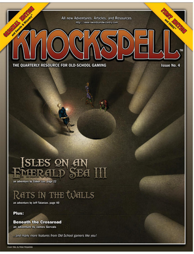 The large size of the level helps to support these kinds of larger, cyclopean (to HPL for a moment) corridors and chambers, which increase that sense of awe and immensity that I want players to experience have when they're exploring Castle Greyhawk. Large spaces and long corridors that extend well-beyond the range of visible light sources, including continual light at 6"radius and bullseye lanterns at 8" range, increase player paranoid and build that sense of scope, or vastness, in particular when that extends above (and sometimes below!) your current walking surface---PCs are moving through an ocean of darkness, in their tiny island bubble of illumination. Peter Fitzpatrick's cover art for Knockspell #4 amply illustrates this concept nicely: